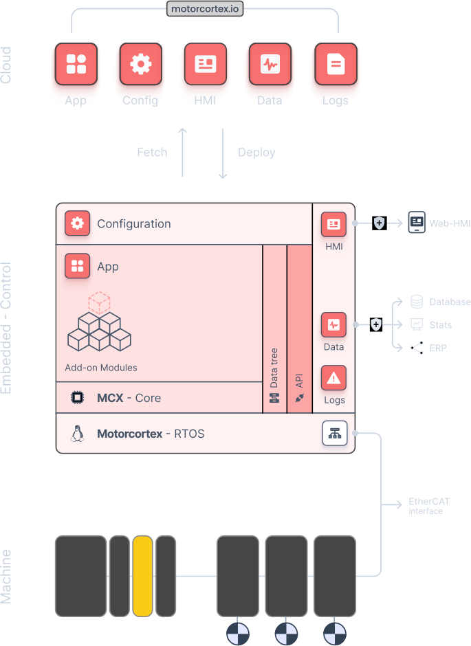 Third party software is also supported, like ROS/ROS2, Localization/Navigation software, Vision software. These can be deployed as Docker / Podman Containers to the embedded system straight from the Motorcortex portal.